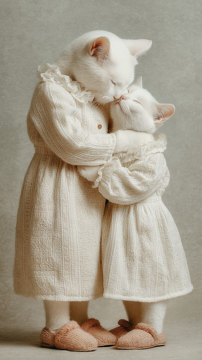 Full size photo with legs of a mum white cat dressed in a dress and slippers and her daughter white cat dressed in the same dress, they are cuddling like mum and daughter tenderly, 100% white flat background