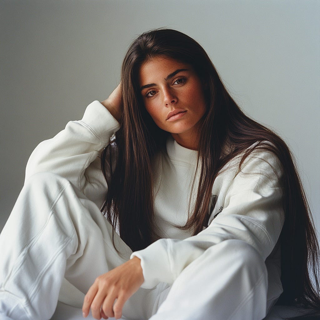 Photo for the sportswear brand Reebok commercial image, editorial style, 1995, high fashion campaign, vogue magazine, Portrait of a woman, age 37, brunette, long straight hair, brown eyes. Dressed in a white Reebok tracksuit. The girl looks into the frame, she radiates kindness and tenderness and joy, her pose demonstrates relaxation and concentration. Sports style, yoga. Studio photo for clothing advertising. Extremely strong detailing, skin texture is drawn in detail. Camera at eye level. Photographer Annie Leibovitz for Vogue magazine. 75 mm lens, frame size 16:9